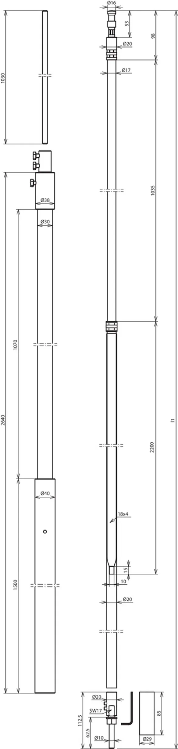 – Supporting tube with insulating section of glass-fibre reinforced plastic (GRP) tube Ø30 mm