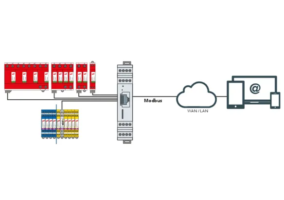 - Monitoring of up to 4 surge arresters with remote signalling contacts and up to 150 BLITZDUCTOR XT arresters (RS 485)