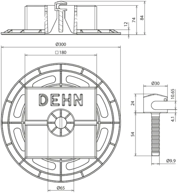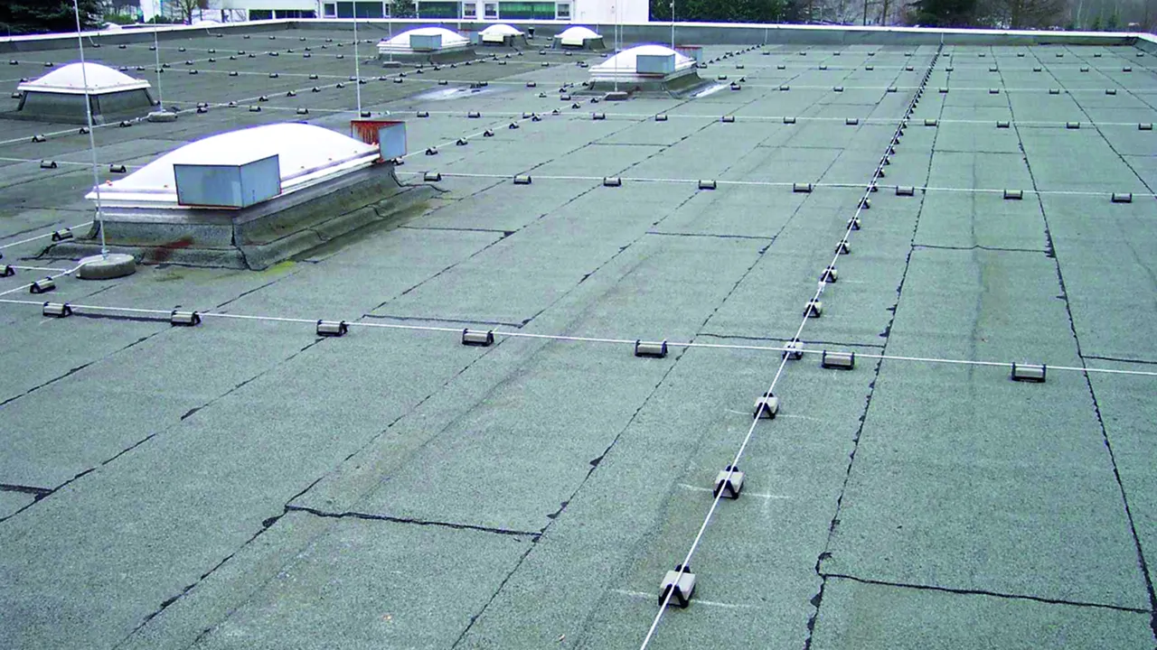Roof conductor holders for attaching round conductors and strips (with adapter) to flat roofs.