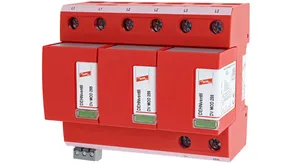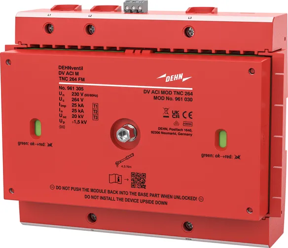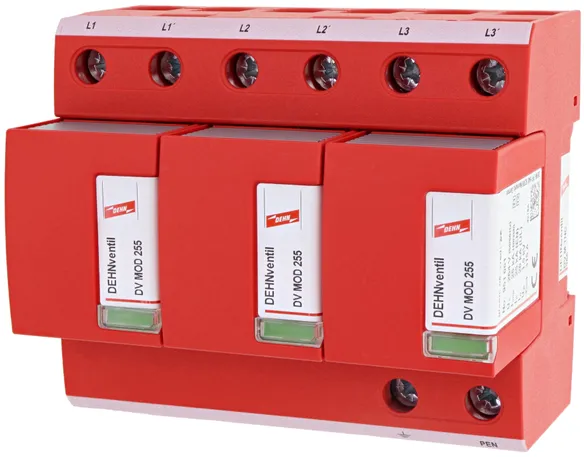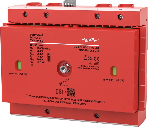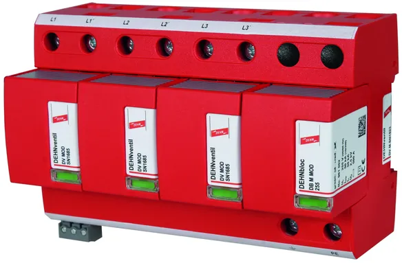 - Prewired spark-gap-based type 1 and type 2 and type 3 combined lightning current and surge arrester consisting of a base part and a single plug-in protection module