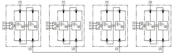 Kit consisting of pluggable lightning and surge arresters, including insulated module wiring bar for use in inverter systems with active anti-PID with maximum DC offset of 750 V DC. Wiring of the earthing systems in accordance with IEC 60364-4-44, Table 44.A1 – RE and Z as well as RE and RA connected.