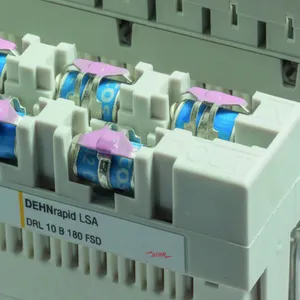 Lightning current carrying DRL plug-in SPD block (10 pairs) for almost all applications. Expandable to a combined lightning current and surge arrester by means of a DRL protective plug. The integrated disconnection block contacts allow testing, measuring and patching with plugged-in protection. The three-pole gas discharge tubes have a fail-safe function with visual fault indication.