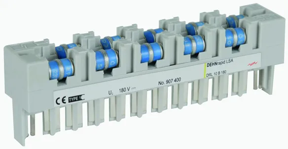 Lightning current carrying DRL plug-in SPD block (10 pairs) with three-pole gas discharge tubes for almost all applications. Expandable to a combined lightning current and surge arrester by means of a DRL protective plug. The integrated disconnection block contacts allow testing, measuring and patching with plugged-in protection.