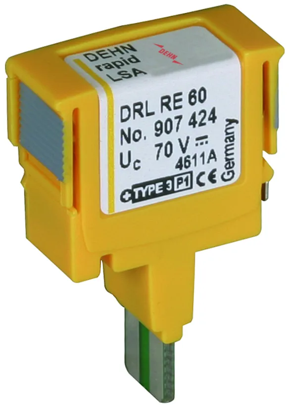 Protective plug (one pair), energy-coordinated with DRL plug-in SPD block, for use as single-stage protective device for terminal equipment. Low voltage protection level line-line and integrated overcurrent protection for ADSL, ISDN Uk0 or a/b lines. To be mounted into EF 10 DRL. Installation recommended only in combination with DRL plug-in SPD block.