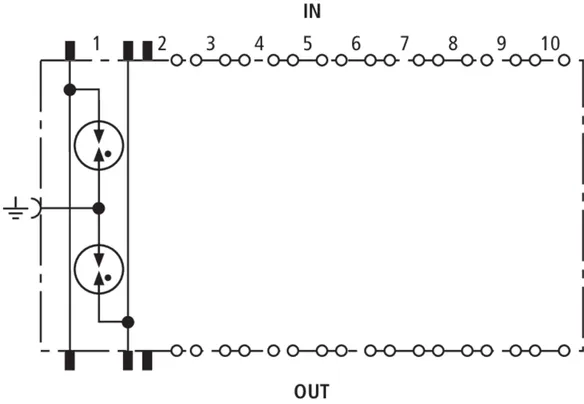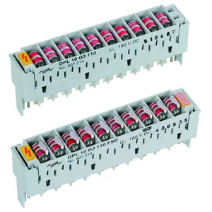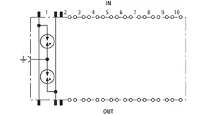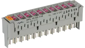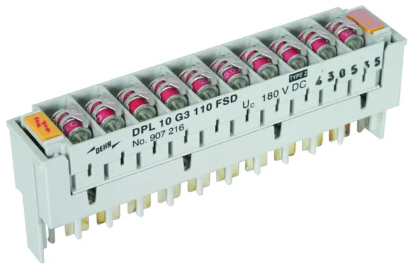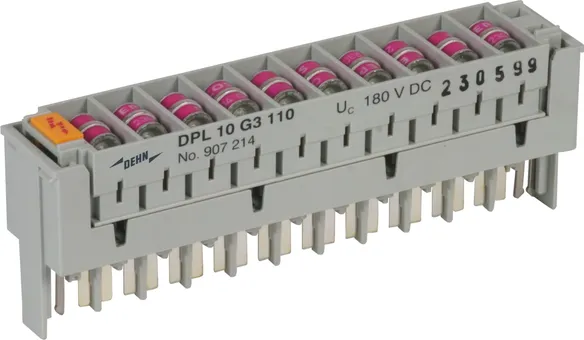Plug-in SPD block for ten pairs with three-pole gas discharge tubes for almost all applications. FSD arresters feature a fail-safe function and an additional visual indication when the fail-safe function has been activated. Thus, it can be immediately identified whether an arrester has to be replaced.
