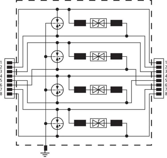 Universal, space-saving combined arrester of 19 mm in width and RJ45 connection system with status indication for simple maintenance. Protection of applications in structured cabling according to class EA to 500 MHz; e.g. industrial Ethernet, data distributors, digital camera systems, Power over Ethernet (IEEE 802.3 compliant to 4PPoE) and Ethernet-based interfaces in general. Protection of all pairs through powerful gas discharge tubes and protective diodes between signal cores and pairs. Fully shielded adapter design with RJ45 sockets for DIN rail mounting. With additional screw connection on the enclosure for an optional earth connection.