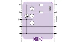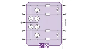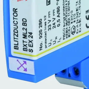 Space-saving surge arrester module with RFID LifeCheck for protecting up to four unearthed single lines sharing a common reference potential in intrinsically safe measuring circuits, meets FISCO requirements. ATEX. Insulation strength > 500 V line-earth.