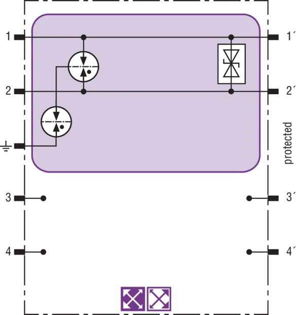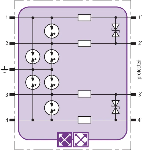 Space-saving surge arrester module with RFID LifeCheck for protecting two pairs in intrinsically safe measuring circuits and bus systems, meets FISCO requirements. ATEX. Insulation strength > 500 V line-earth.