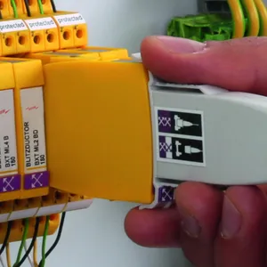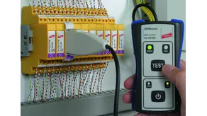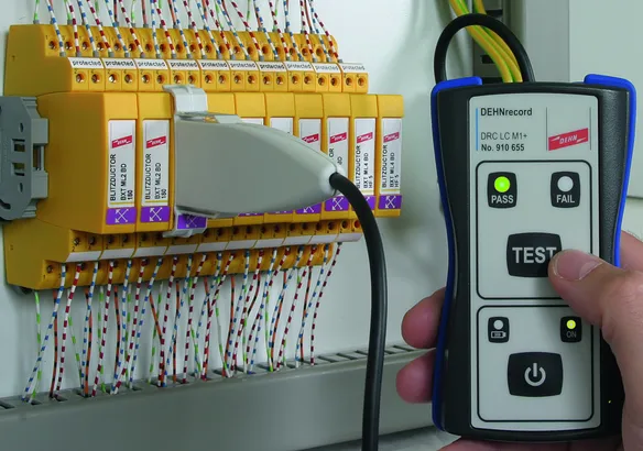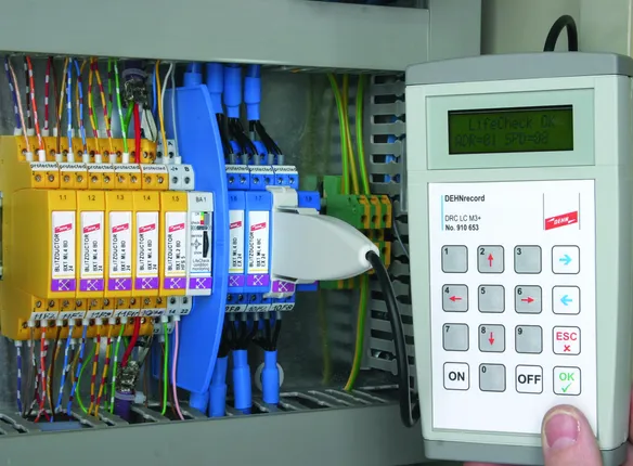Portable device with LifeCheck sensor for flexible use. For quickly and easily checking arresters with RFIDLifeCheck. Operation and charge indication and the result indication of the LifeCheck test are provided through LEDs. The DRC LC M1+ is equipped with an RFIDsnap-on LifeCheck sensor.