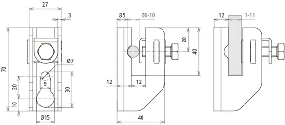 Thrust piece with M8 screw for installing flat strips up to 11 mm and round conductors 6-10 mm.