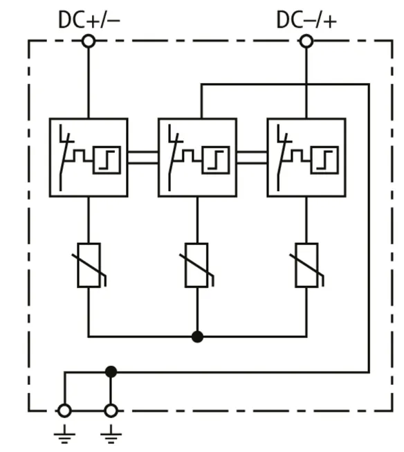 • Prewired type 1 + type 2 combined lightning current and surge arrester for use in photovoltaic generator circuits