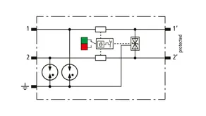 Combined arrester protection module with a width of 6 mm for BLITZDUCTORconnect with status indication for protecting one pair in 24 V DC systems. Also suitable for use with an earthed negative pole. Integrated PTC resistors allow for secure resetting of the arrester after interference in the system circuit with short-circuit currents of up to 40 A.