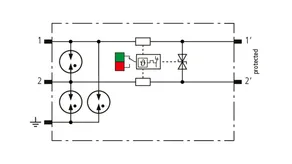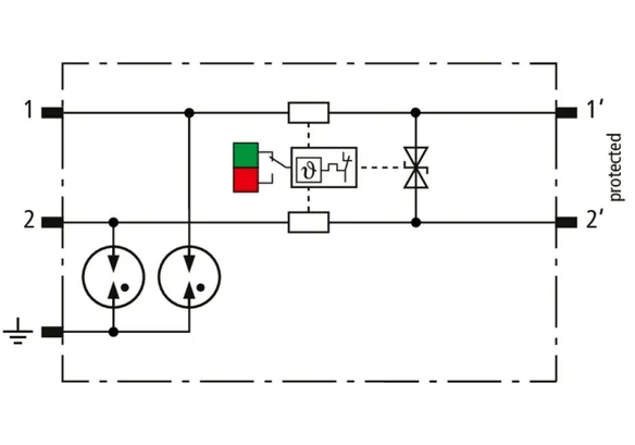 Space-saving, modular lightning current arrester with a width of 6 mm and push-in connection technology with status indication for protecting two single lines for lightning equipotential bonding as well as indirect earthing of shielded cables. With signal disconnection for maintenance purposes.