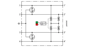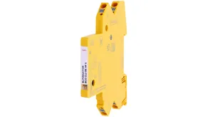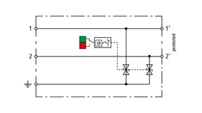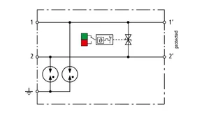 Space-saving, compact surge arrester with a width of 6 mm and push-in connection technology with status indication. Finely limiting, single-stage surge protection with powerful diodes for protecting two single cores sharing a common reference potential as well as unbalanced interfaces.
